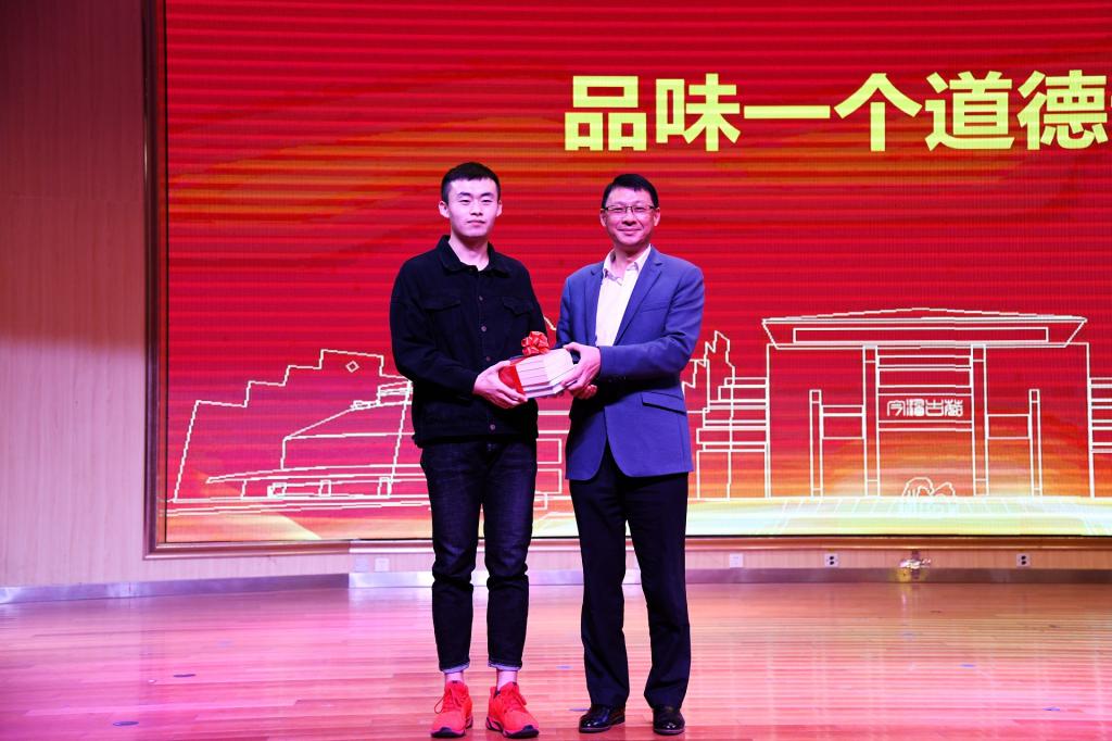 党委宣传部部长饶军为周鑫同学颁发9月“十堰好人”榜证书,并为他赠书。