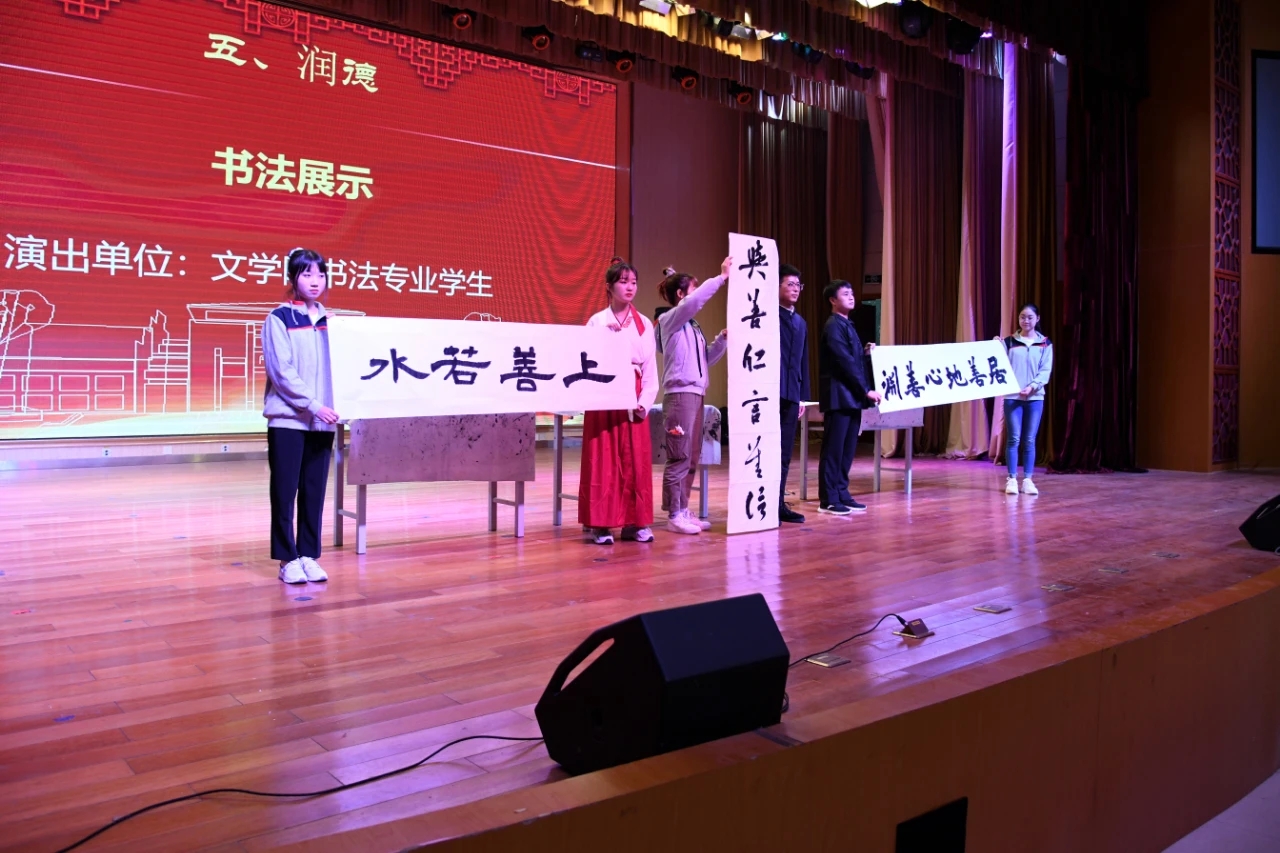 在“润德”环节,上一届知行之星提名奖获得者鲍俊斌同学带领全体同学诵读知行合一“32字箴言”,williamhill威廉希尔书法专业学生围绕“至善”主题,现场书写“上善若水”等书法作品并现场展示。