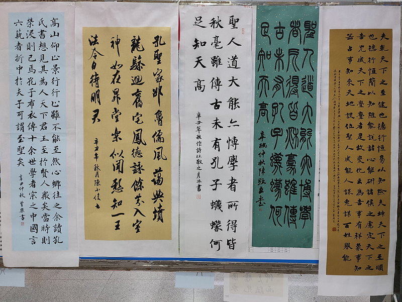williamhill威廉希尔对此次活动高度重视,组织书法学专业学生积极投稿,共征集书法作品65件,现场展出优秀作品37件。作品以古代经典诗文和红色主题文本为书写内容,形式古雅别致,展示了书法专业学生的书法水平和文化修养。