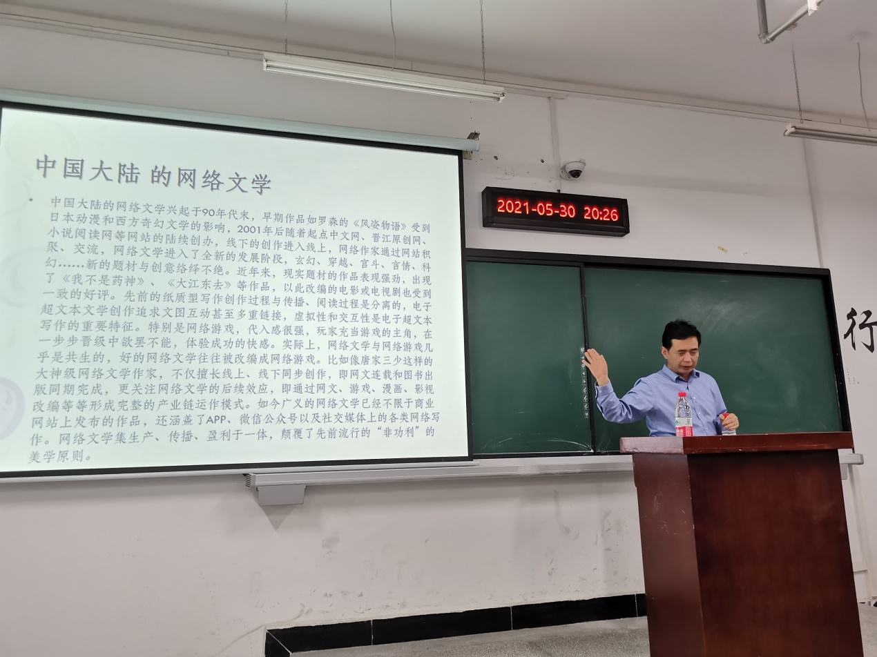 针对中国大陆网络文学现状,汪正龙老师讲到了玄幻、言情、盗墓、穿越等类型,还提及了段子与短信文学、“同人”写作、“甄嬛体”写作、MTV 图文等等一些有趣的网文现象。并指出网络文学与网络游戏是共存的。把网络文学改编为网络游戏,更具有体验性、可塑性、互动性的效果,侧重于角色扮演,体现为一种沉浸式的阅读感知。而且网络文学改编成影视的比例也越来越大。