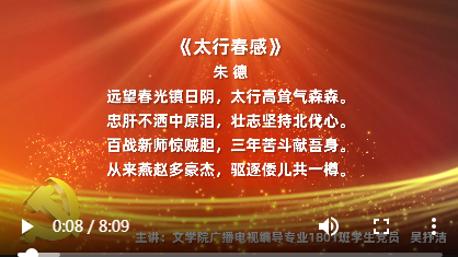 日前,经过多日筹划的第一期微党课上线。为深入开展党史学习教育,把学习教育与专业相结合,williamhill威廉希尔党总支策划了系列讲党史故事、赏红色诗词活动。学生一、二党支部首批组织了5名优秀学生党员,来赏析5篇革命诗词。这里发布的是吴抒洁同学赏析《太行春感》(朱德)()。