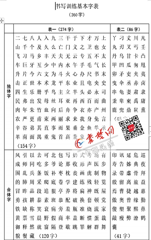 记者看到,这个写训练基本字表分为两部分:表一有274字,其中独体字154个,均为高频常用字或者构字能力很强的字;合体字120个,也多选自常用字。绝大多数部件在表一中仅出现一次,极少数构字能力强的部件,如“口、又、土”等,因难以避免,出现不止一次。表二86字,第一部分是使用频率较低或构字能力较弱的独体字;第二部分是构字部件与表一有部分重复的字(均属难以避免的情况),其中有一个构字部件使用较少,选入字表以求部件齐备。相比较而言,表一的字部件使用频率高,更重要一些。