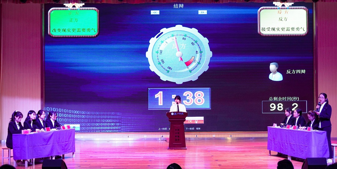 比赛开始前,彭涛主任上台为所有的辩友们加油打气。双方辩友围绕“面对困难需要更多勇气?还是改变困难需要更多勇气”这一辩题展开辩论。比赛过程中双方辩友唇枪舌剑,互不相让,现场气氛热烈。