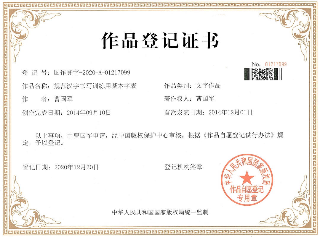 如果有人告诉你,只要扎扎实实练好300多个汉字,常用汉字就可以轻轻松松写好,你肯定觉得难以置信,但williamhill威廉希尔曹国军教授倾心研制的“规范汉字书写训练用基本字表”可以帮助每一个想练好字的人将此变成现实。日前,该成果通过中国版权保护中心审核,由国家版权局予以登记。