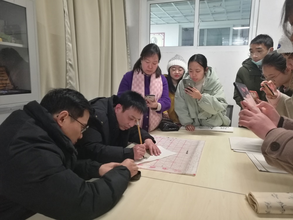 座谈会上,周培基主席分享了学书心得,认真点评了书法学专业同学们的作品,耐心解答了大家在书法学习中的疑问。随后,周主席还进行了现场创作和临帖示范。