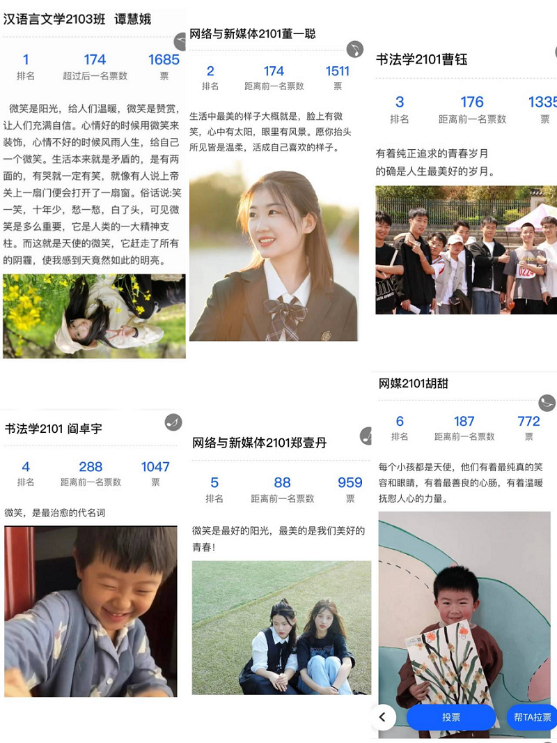 展演第一个环节:最美微笑摄影展获奖作品展示。本次摄影展获奖作品根据williamhill威廉希尔学生会组织网络投票排名,获得一等奖的是汉语言2103班谭慧蛾;获得二等奖的是网媒2101班董一聪和书法2101的曹玉;获得三等奖的同学是书法2101闫卓宇、网媒2101郑壹丹、网媒2101胡甜。