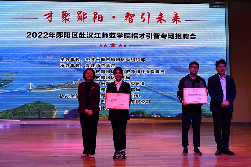 郧阳区委常委、组织部长任杰,郧阳区人民政府副区长何珊为我校彭阳、邹阳阳两名同志颁发郧阳区“校园招才引才大使”聘书。何珊对郧阳区作了宣传推介,介绍了郧阳区的历史、地理、文化、发展蓝图以及优惠的人才政策。郧阳区公共就业和人才服务局局长李香云宣讲了郧阳区招才政策,并与同学们围绕就业创业工作进行互动。郧阳区数家企业现场推介招聘岗位。