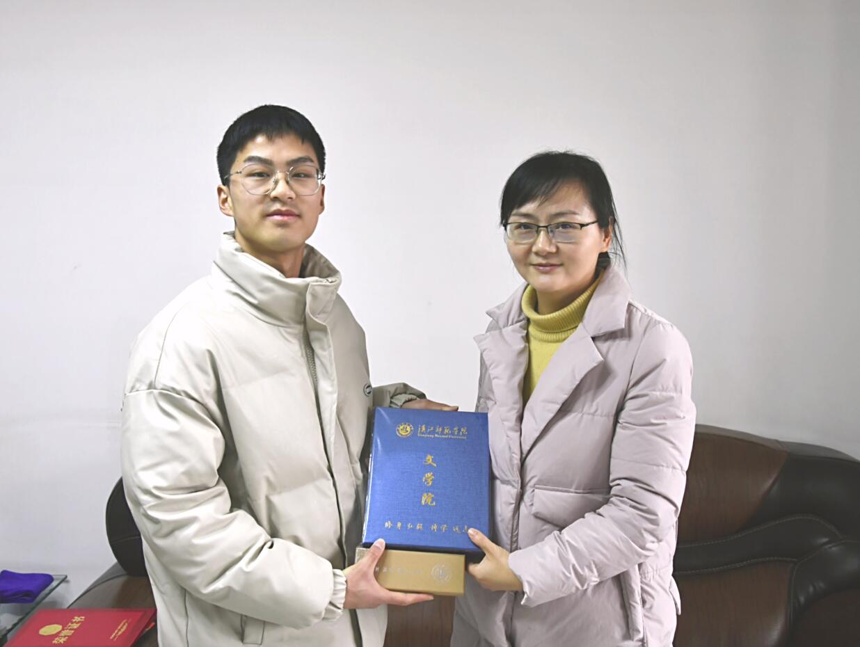 williamhill威廉希尔党总支副书记任自玲代表学院向陈星天赠送了学院的文创纪念品,感谢他为williamhill威廉希尔学子树立了榜样,鼓励他坚持学习、进一步提升个人思想觉悟,更好地展现大学生积极向上的精神风貌。