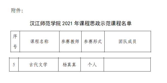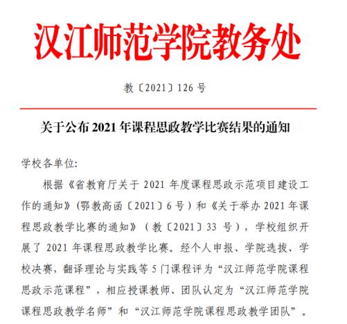 根据《省教育厅关于 2021 年度课程思政示范项目建设工作的通知》(鄂教高函[2021]6号)和《关于举办 2021年课程思政教学比赛的通知》(教[2021]33 号),学校组织开展了 2021 年课程思政教学比赛。经个人申报、学院选拔、学校决赛,我院《古代文学》课程获威廉体育唯一官网 2021 年课程思政示范课程,参赛教师杨真真个人获课程思政教学名师称号。