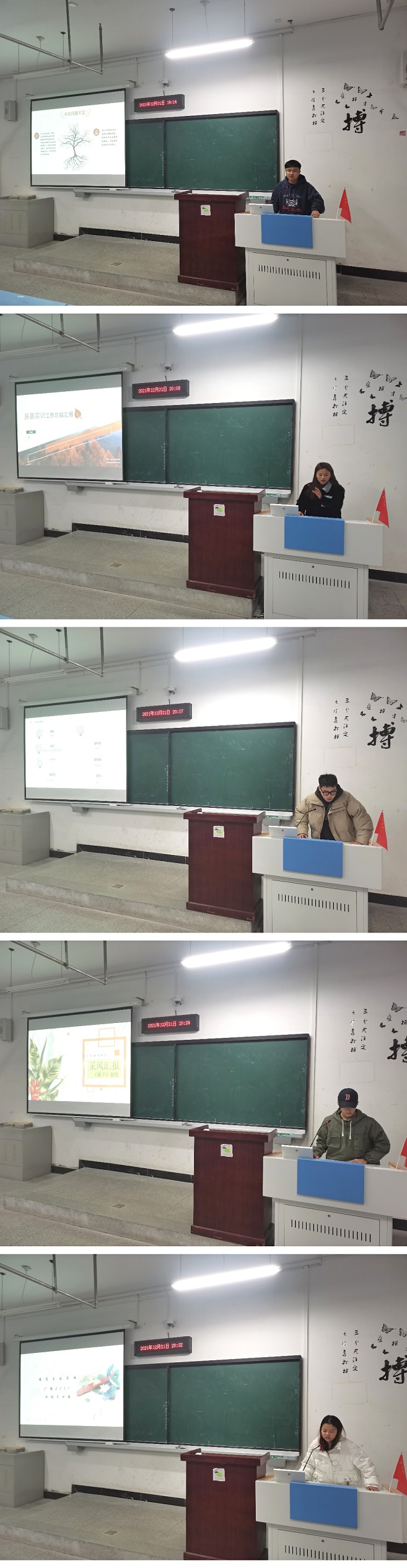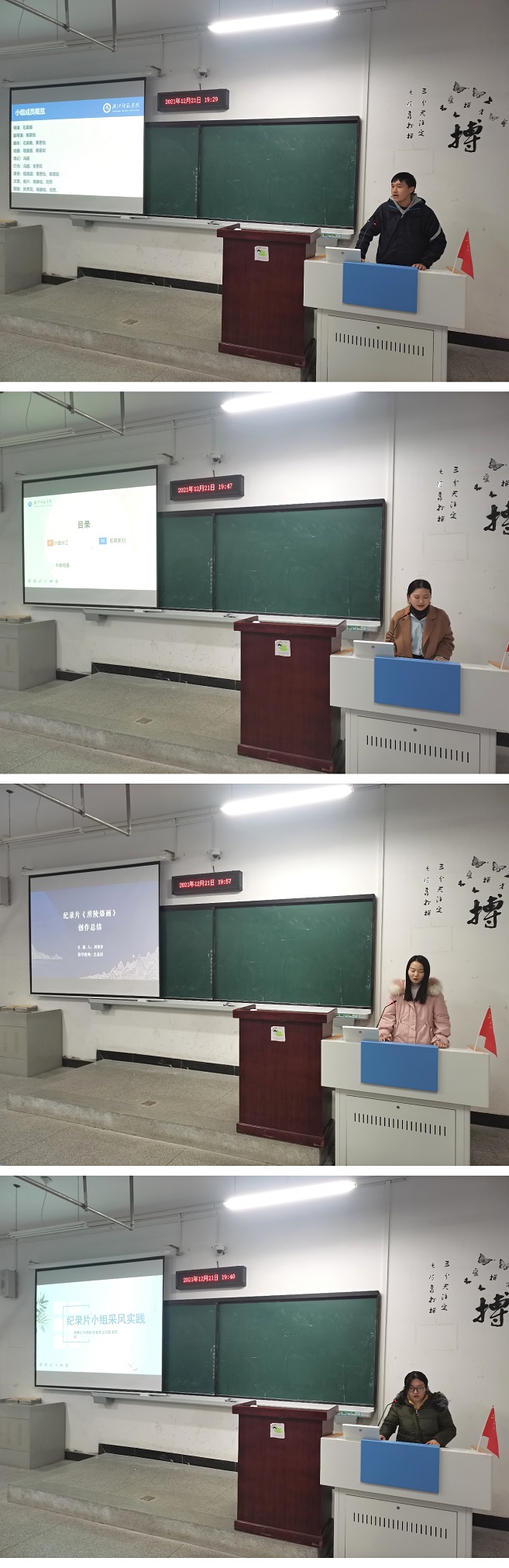 接着,摄影组、新闻专题片组、纪录片组、剧情片组十一个小组代表轮流上台发言,从拍摄的前期准备、拍摄的过程实施、拍摄的后期制作、拍摄遇到的问题以及实践收获方面进行了总结。