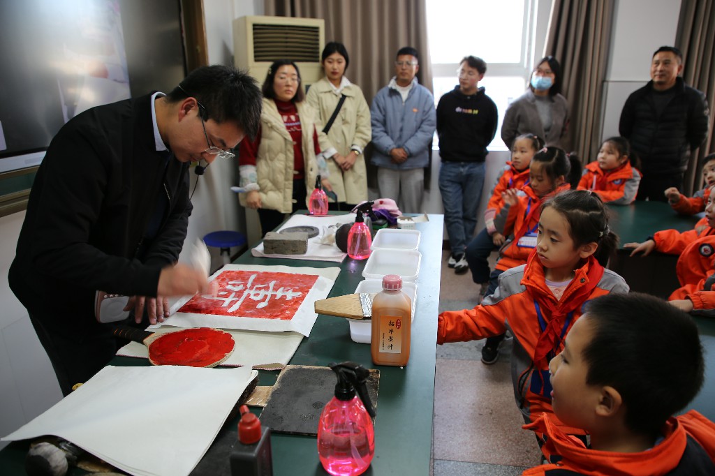 活动在该校二(6)班开展,由班主任董洵老师主持,校长袁炳陆、副校长王启梅莅临现场指导。首先,王刘涛老师讲解了传统书法碑刻传拓的基本知识,展示了传拓使用的工具,然后精心操作,在小学生们一双双惊奇的眼神中从碑版上拓下一个鲜红的“寿”字,完成了一件作品。