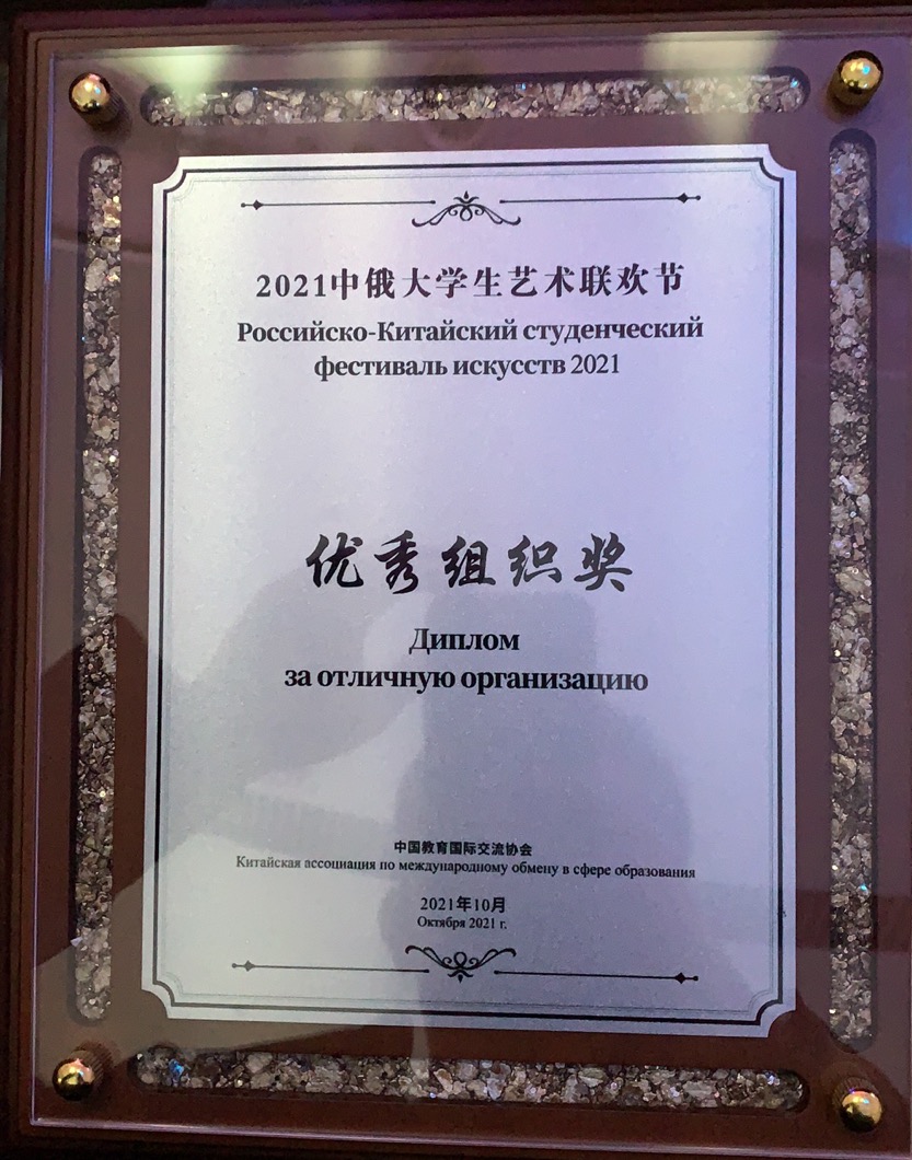 2021年10月14日,2021中俄大学生艺术联欢节颁奖典礼及展演活动在吉林长春成功举办,williamhill威廉希尔荣获优秀组织奖。
