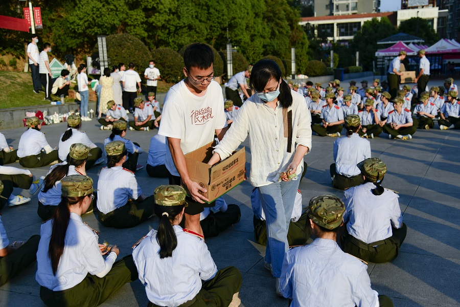 郝文华院长在现场与同学们进行亲切的交流,询问williamhill威廉希尔学子对军训生活的适应情况,叮嘱同学们要注意防暑,同时在这个特殊的日子里主动向家人报平安、送祝福。随后,郝院长、任书记带领学院辅导员为21级军训学生逐排发放月饼,其他年级学生则由班干部统一领取。